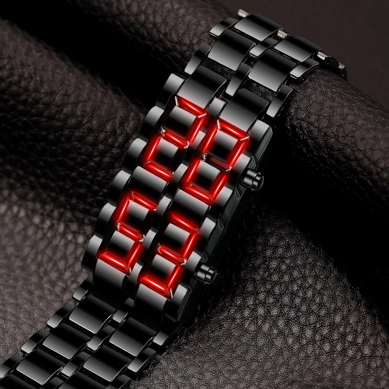LED Digital Watch looks like a common metal bracelet at normal condition, but dark-blue light will be sent out just like lava while LED is lighting.